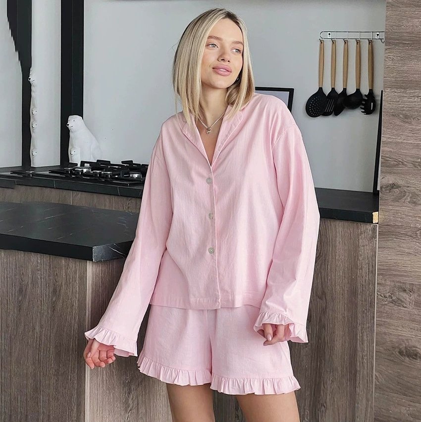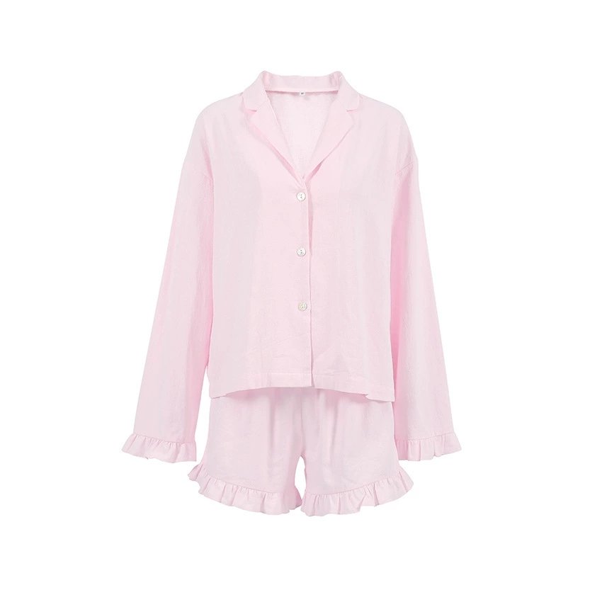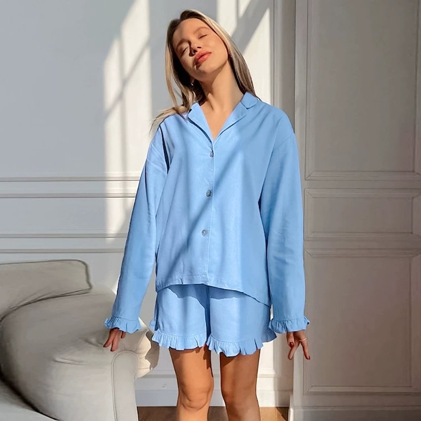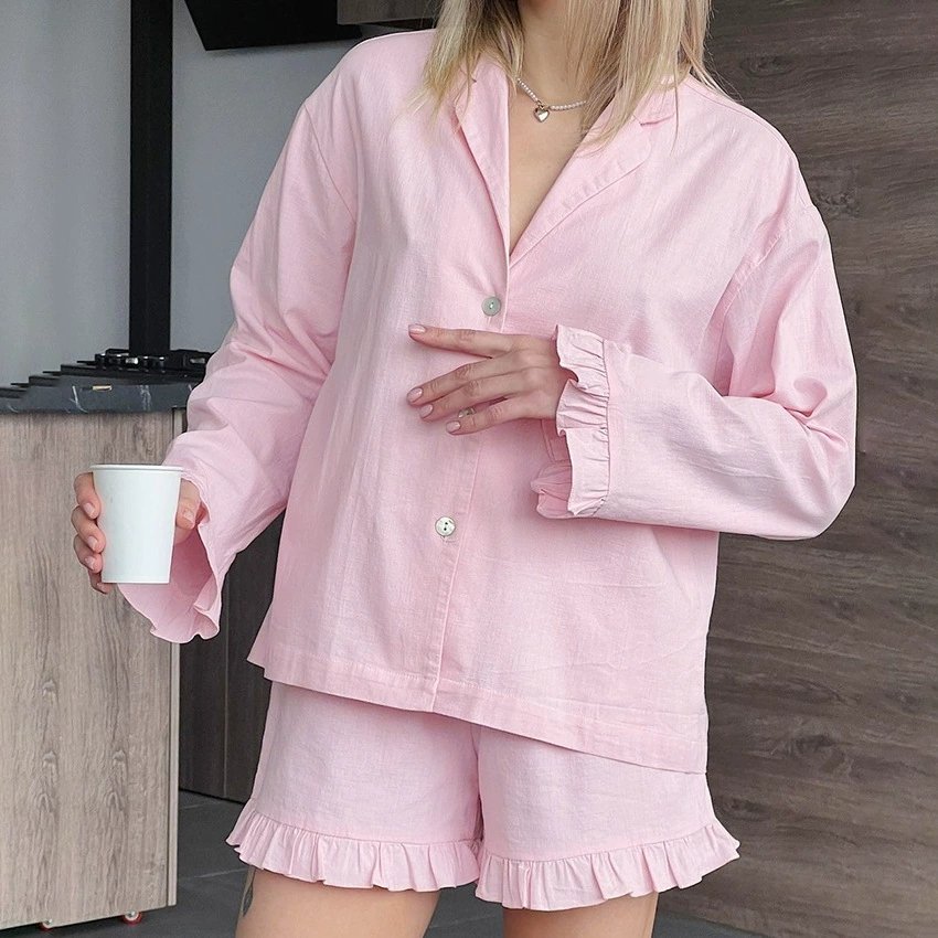 Ruffled-sleeve 100% cotton breathable long-sleeve and shorts women’s loungewear