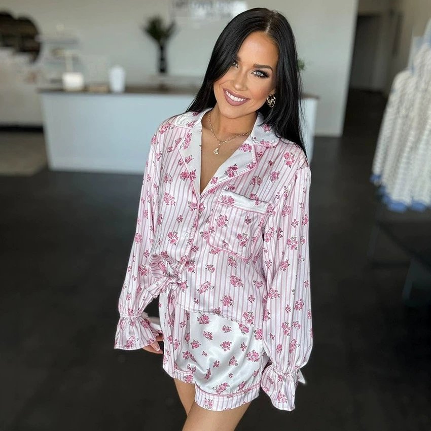 The ruffled-sleeve, skin-friendly pajama set loungewear allows you to wear it on any occasion.